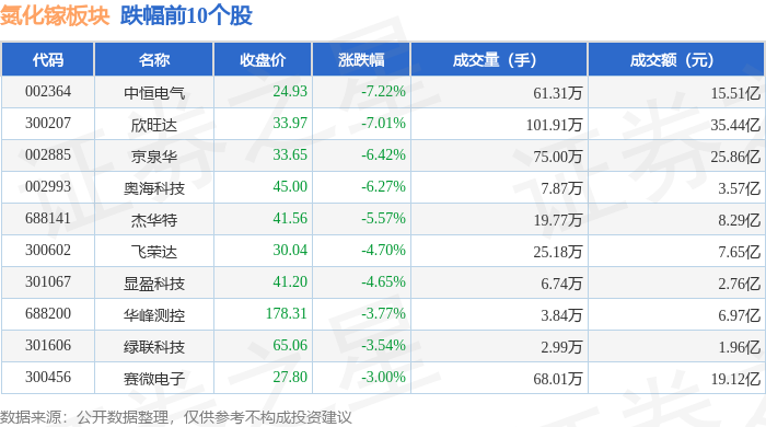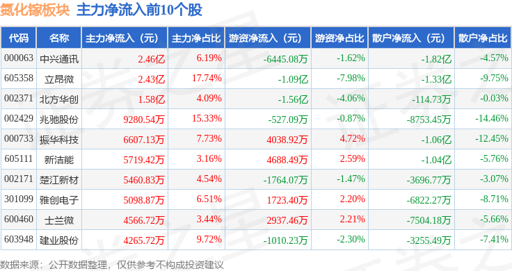 从资金流向上来看,当日氮化镓板块主力资金净流出35.12亿元,游资资金净流入10.19亿元,散户资金净流入24.93亿元。氮化镓板块个股资金流向见下表: