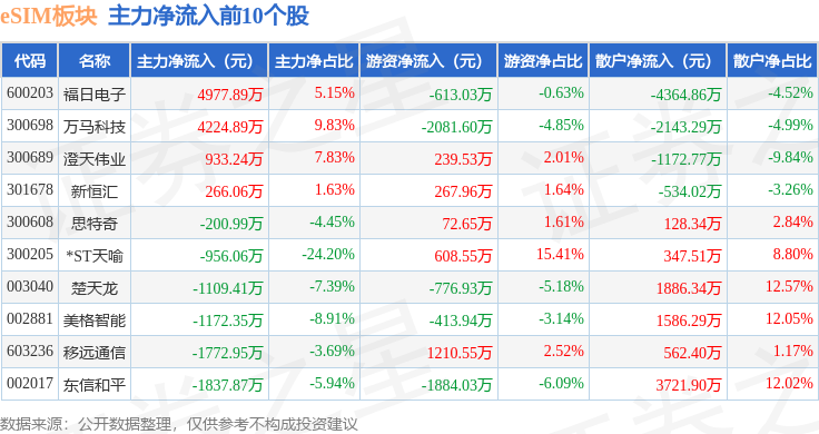 从资金流向上来看,当日eSIM板块主力资金净流出2.29亿元,游资资金净流入231.79万元,散户资金净流入2.27亿元。eSIM板块个股资金流向见下表: