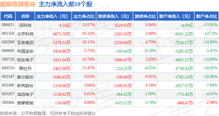 从资金流向上来看,当日超级电容板块主力资金净流出8.48亿元,游资资金净流入1.18亿元,散户资金净流入7.29亿元。超级电容板块个股资金流向见下表: