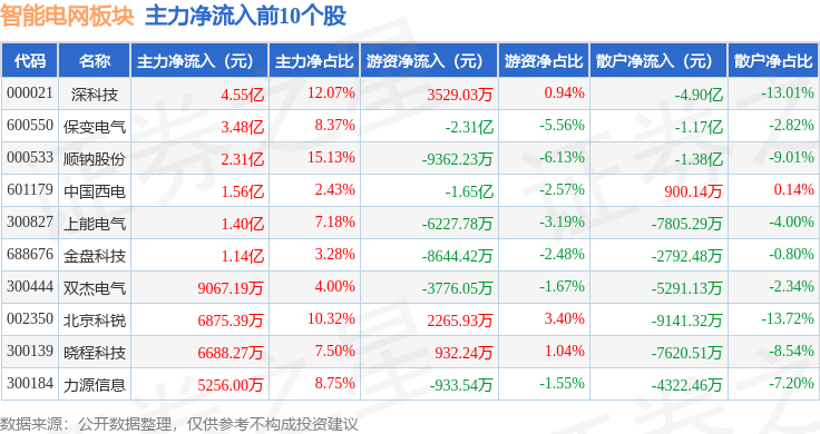从资金流向上来看,当日智能电网板块主力资金净流出27.4亿元,游资资金净流入3.1亿元,散户资金净流入24.3亿元。智能电网板块个股资金流向见下表: