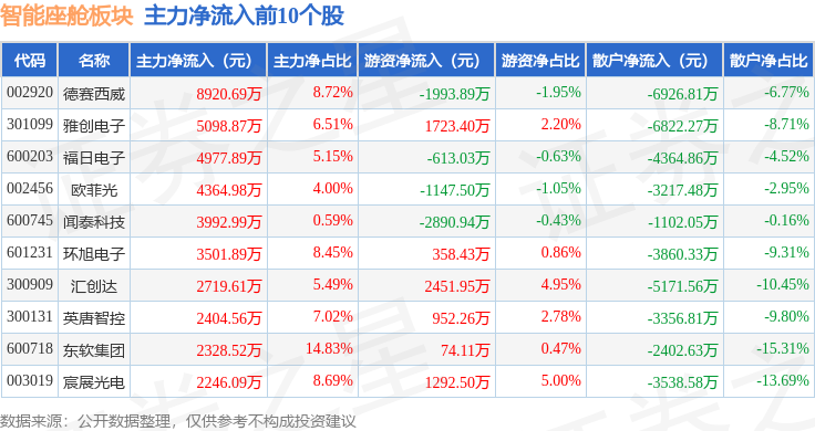从资金流向上来看,当日智能座舱板块主力资金净流出5.19亿元,游资资金净流入2.73亿元,散户资金净流入2.46亿元。智能座舱板块个股资金流向见下表: