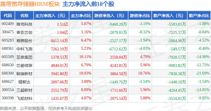 从资金流向上来看,当日高带宽存储器HBM板块主力资金净流出2.88亿元,游资资金净流入3.4亿元,散户资金净流出5184.03万元。高带宽存储器HBM板块个股资金流向见下表: