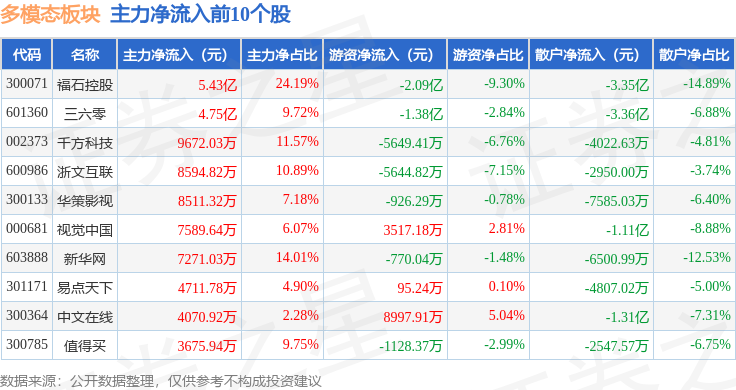 从资金流向上来看,当日多模态板块主力资金净流入7.48亿元,游资资金净流入8349.84万元,散户资金净流出8.31亿元。多模态板块个股资金流向见下表: