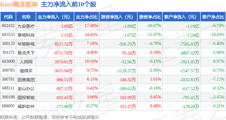 从资金流向上来看,当日Kimi概念板块主力资金净流入4.65亿元,游资资金净流出1.88亿元,散户资金净流出2.77亿元。Kimi概念板块个股资金流向见下表: