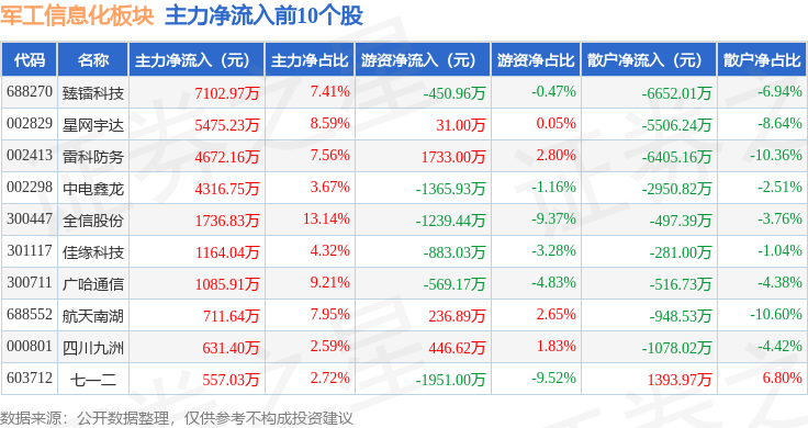 从资金流向上来看,当日军工信息化板块主力资金净流出8.21亿元,游资资金净流入1.78亿元,散户资金净流入6.43亿元。军工信息化板块个股资金流向见下表:
