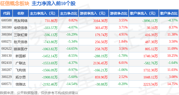 从资金流向上来看,当日征信概念板块主力资金净流出3.59亿元,游资资金净流入9669.62万元,散户资金净流入2.63亿元。征信概念板块个股资金流向见下表: