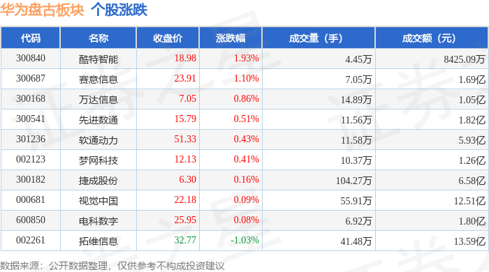 证券之星消息,11月10日华为盘古板块较上一交易日上涨0.08%,酷特智能领涨。当日上证指数报收于4018.6,上涨0.53%。深证成指报收于13427.61,上涨0.18%。华为盘古板块个股涨跌见下表: