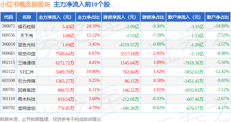 从资金流向上来看,当日小红书概念股板块主力资金净流入9.66亿元,游资资金净流出2.76亿元,散户资金净流出6.9亿元。小红书概念股板块个股资金流向见下表: