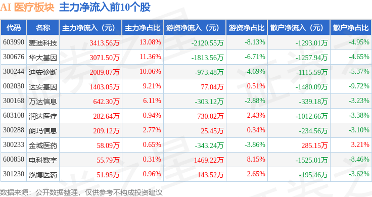 从资金流向上来看,当日AI 医疗板块主力资金净流入3812.12万元,游资资金净流出967.33万元,散户资金净流出2844.79万元。AI 医疗板块个股资金流向见下表: