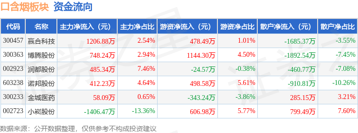 从资金流向上来看,当日口含烟板块主力资金净流入1504.32万元,游资资金净流入2360.54万元,散户资金净流出3864.86万元。口含烟板块个股资金流向见下表:
