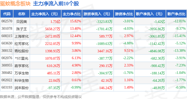 从资金流向上来看,当日驱蚊概念板块主力资金净流入1.89亿元,游资资金净流出2785.62万元,散户资金净流出1.61亿元。驱蚊概念板块个股资金流向见下表: