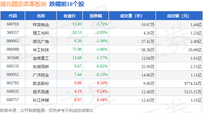 从资金流向上来看,当日湖北国企改革板块主力资金净流出5.13亿元,游资资金净流入518.95万元,散户资金净流入5.08亿元。湖北国企改革板块个股资金流向见下表: