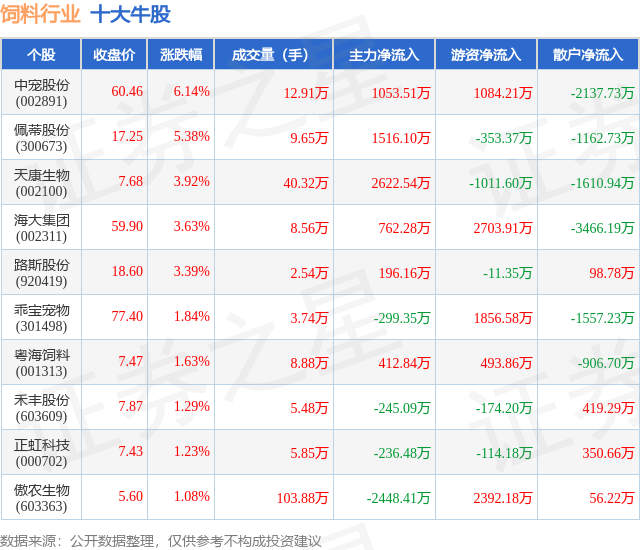 个股表现方面,饲料行业当日领涨股为中宠股份(002891),该股当日报收60.46,上涨6.14%,成交量12.91万,主力资金净流入1053.51万元。佩蒂股份(300673)以上涨5.38%紧随其后,该股当日成交量9.65万,主力资金净流入1516.1万元。除此之外,天康生物(002100)、海大集团(002311)、路斯股份(920419)均进入当日牛股之列。具体个股列表见下表: