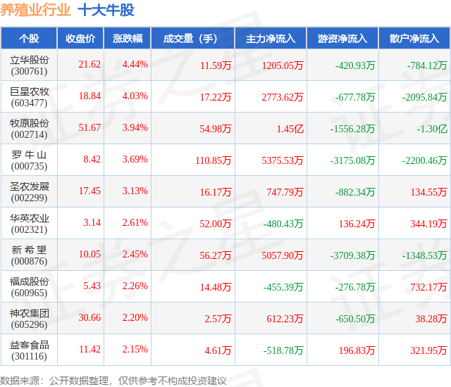 个股表现方面,养殖业行业当日领涨股为立华股份(300761),该股当日报收21.62,上涨4.44%,成交量11.59万,主力资金净流入1205.05万元。巨星农牧(603477)以上涨4.03%紧随其后,该股当日成交量17.22万,主力资金净流入2773.62万元。除此之外,牧原股份(002714)、罗 牛 山(000735)、圣农发展(002299)均进入当日牛股之列。具体个股列表见下表: