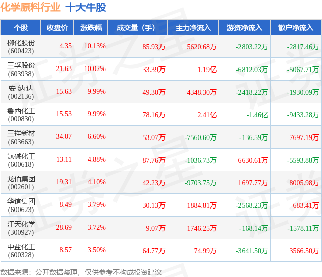 个股表现方面,化学原料行业当日领涨股为柳化股份(600423),该股当日报收4.35,上涨10.13%,成交量85.93万,主力资金净流入5620.68万元。三孚股份(603938)以上涨10.02%紧随其后,该股当日成交量33.39万,主力资金净流入1.19亿元。除此之外,安 纳 达(002136)、鲁西化工(000830)、三祥新材(603663)均进入当日牛股之列。具体个股列表见下表: