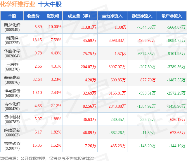 个股表现方面,化学纤维行业当日领涨股为新乡化纤(000949),该股当日报收5.39,上涨10.0%,成交量113.81万,主力资金净流入1.3亿元。新凤鸣(603225)以上涨7.59%紧随其后,该股当日成交量45.69万,主力资金净流入3098.83万元。除此之外,华峰化学(002064)、三房巷(600370)、蒙泰高新(300876)均进入当日牛股之列。具体个股列表见下表: