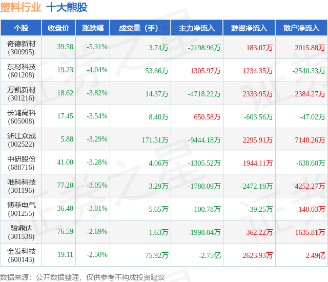 个股表现方面,塑料行业当日领跌股为奇德新材(300995),该股当日报收39.58,下跌5.31%,成交量3.74万,主力资金净流出2198.96万元。东材科技(601208)以下跌4.04%紧随其后,该股当日成交量53.66万,主力资金净流入1305.97万元。除此之外,万凯新材(301216)、长鸿高科(605008)、浙江众成(002522)均进入当日熊股之列。具体个股列表见下表: