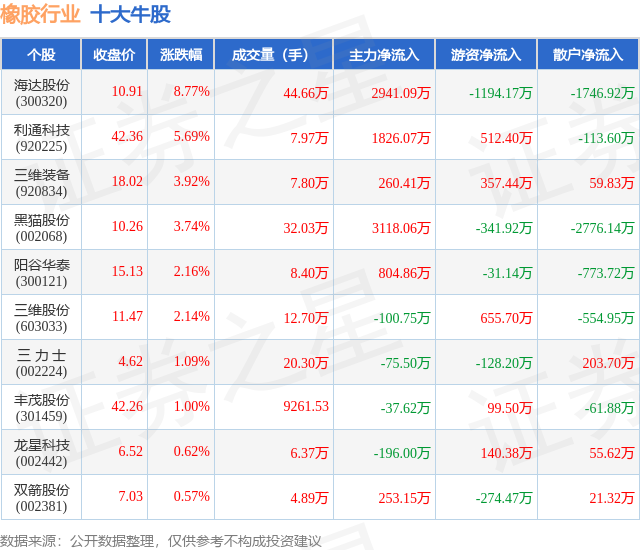 个股表现方面,橡胶行业当日领涨股为海达股份(300320),该股当日报收10.91,上涨8.77%,成交量44.66万,主力资金净流入2941.09万元。利通科技(920225)以上涨5.69%紧随其后,该股当日成交量7.97万,主力资金净流入1826.07万元。除此之外,三维装备(920834)、黑猫股份(002068)、阳谷华泰(300121)均进入当日牛股之列。具体个股列表见下表: