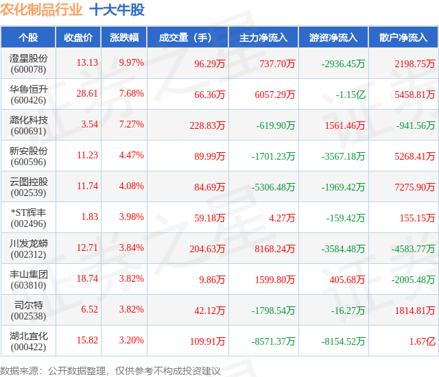 个股表现方面,农化制品行业当日领涨股为澄星股份(600078),该股当日报收13.13,上涨9.97%,成交量96.29万,主力资金净流入737.7万元。华鲁恒升(600426)以上涨7.68%紧随其后,该股当日成交量66.36万,主力资金净流入6057.29万元。除此之外,潞化科技(600691)、新安股份(600596)、云图控股(002539)均进入当日牛股之列。具体个股列表见下表: