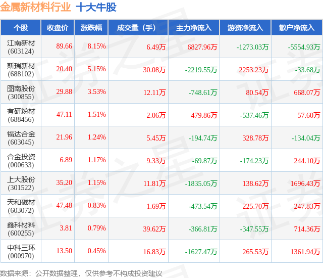 个股表现方面,金属新材料行业当日领涨股为江南新材(603124),该股当日报收89.66,上涨8.15%,成交量6.49万,主力资金净流入6827.96万元。斯瑞新材(688102)以上涨5.15%紧随其后,该股当日成交量30.08万,主力资金净流出2219.55万元。除此之外,图南股份(300855)、有研粉材(688456)、福达合金(603045)均进入当日牛股之列。具体个股列表见下表: