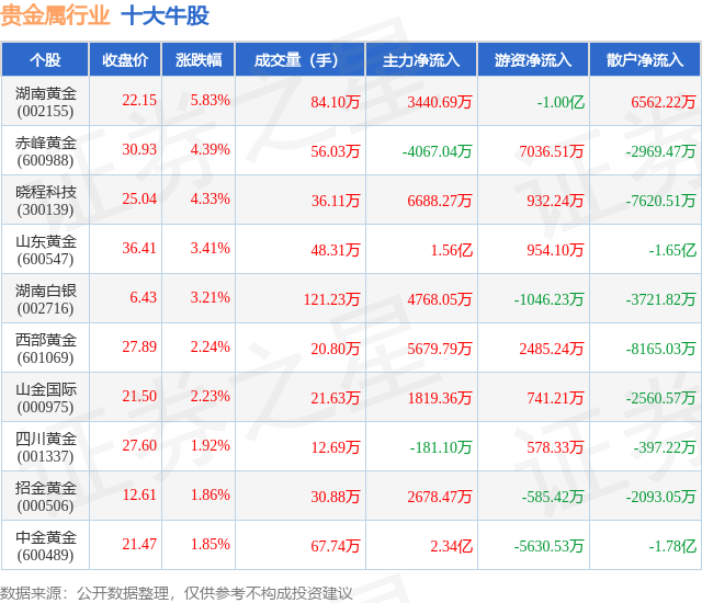 个股表现方面,贵金属行业当日领涨股为湖南黄金(002155),该股当日报收22.15,上涨5.83%,成交量84.1万,主力资金净流入3440.69万元。赤峰黄金(600988)以上涨4.39%紧随其后,该股当日成交量56.03万,主力资金净流出4067.04万元。除此之外,晓程科技(300139)、山东黄金(600547)、湖南白银(002716)均进入当日牛股之列。具体个股列表见下表: