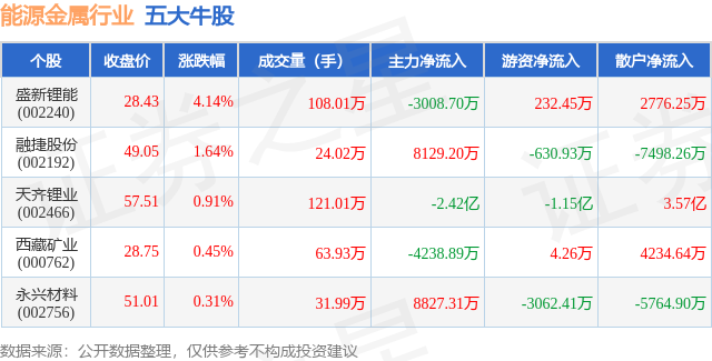 个股表现方面,能源金属行业当日领涨股为盛新锂能(002240),该股当日报收28.43,上涨4.14%,成交量108.01万,主力资金净流出3008.7万元。融捷股份(002192)以上涨1.64%紧随其后,该股当日成交量24.02万,主力资金净流入8129.2万元。除此之外,天齐锂业(002466)、西藏矿业(000762)、永兴材料(002756)均进入当日牛股之列。具体个股列表见下表: