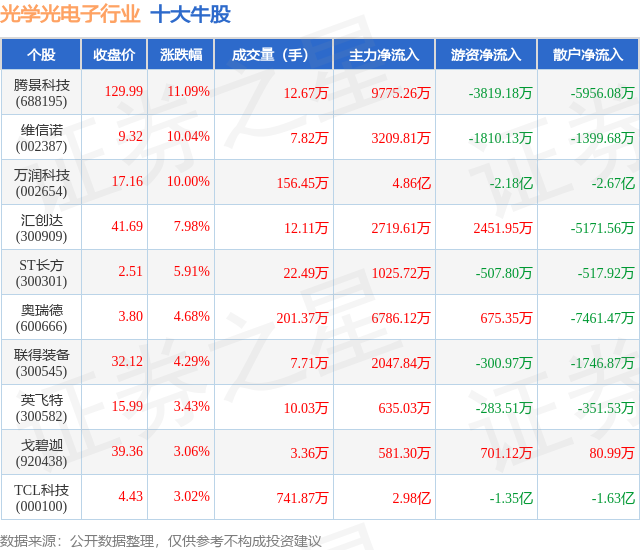 个股表现方面,光学光电子行业当日领涨股为腾景科技(688195),该股当日报收129.99,上涨11.09%,成交量12.67万,主力资金净流入9775.26万元。维信诺(002387)以上涨10.04%紧随其后,该股当日成交量7.82万,主力资金净流入3209.81万元。除此之外,万润科技(002654)、汇创达(300909)、ST长方(300301)均进入当日牛股之列。具体个股列表见下表: