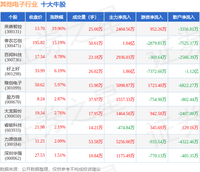 个股表现方面,其他电子行业当日领涨股为英唐智控(300131),该股当日报收13.7,上涨19.96%,成交量25.0万,主力资金净流入2404.56万元。香农芯创(300475)以上涨15.19%紧随其后,该股当日成交量50.61万,主力资金净流入1.04亿元。除此之外,百邦科技(300736)、好上好(001298)、雅创电子(301099)均进入当日牛股之列。具体个股列表见下表: