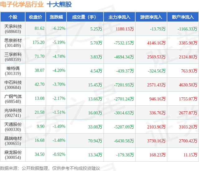 个股表现方面,电子化学品行业当日领跌股为天承科技(688603),该股当日报收81.62,下跌6.22%,成交量5.25万,主力资金净流入1180.13万元。思泉新材(301489)以下跌5.19%紧随其后,该股当日成交量5.7万,主力资金净流出7532.15万元。除此之外,三孚新科(688359)、唯特偶(301319)、中石科技(300684)均进入当日熊股之列。具体个股列表见下表: