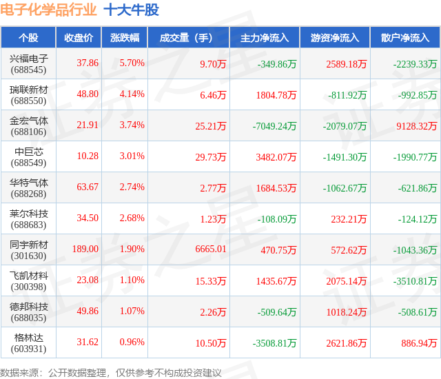 个股表现方面,电子化学品行业当日领涨股为兴福电子(688545),该股当日报收37.86,上涨5.7%,成交量9.7万,主力资金净流出349.86万元。瑞联新材(688550)以上涨4.14%紧随其后,该股当日成交量6.46万,主力资金净流入1804.78万元。除此之外,金宏气体(688106)、中巨芯(688549)、华特气体(688268)均进入当日牛股之列。具体个股列表见下表: