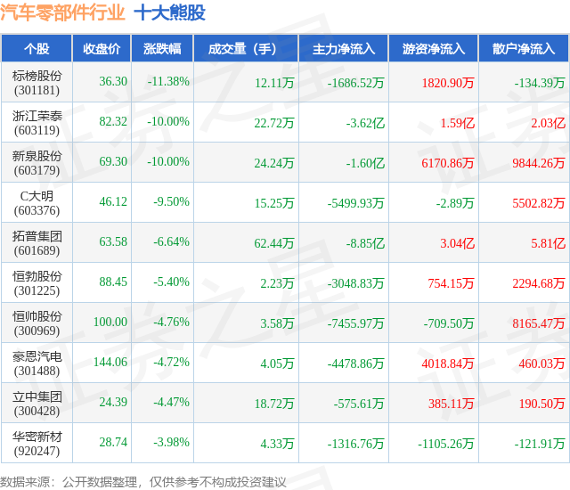 个股表现方面,汽车零部件行业当日领跌股为标榜股份(301181),该股当日报收36.3,下跌11.38%,成交量12.11万,主力资金净流出1686.52万元。浙江荣泰(603119)以下跌10.0%紧随其后,该股当日成交量22.72万,主力资金净流出3.62亿元。除此之外,新泉股份(603179)、C大明(603376)、拓普集团(601689)均进入当日熊股之列。具体个股列表见下表: