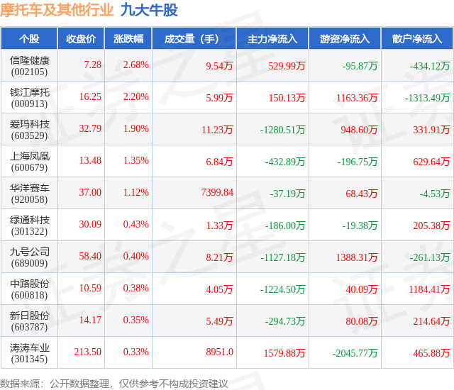 个股表现方面,摩托车及其他行业当日领涨股为信隆健康(002105),该股当日报收7.28,上涨2.68%,成交量9.54万,主力资金净流入529.99万元。钱江摩托(000913)以上涨2.2%紧随其后,该股当日成交量5.99万,主力资金净流入150.13万元。除此之外,爱玛科技(603529)、上海凤凰(600679)、华洋赛车(920058)均进入当日牛股之列。具体个股列表见下表: