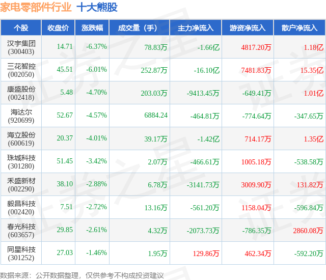个股表现方面,家电零部件行业当日领跌股为汉宇集团(300403),该股当日报收14.71,下跌6.37%,成交量78.83万,主力资金净流出1.66亿元。三花智控(002050)以下跌6.01%紧随其后,该股当日成交量252.87万,主力资金净流出16.1亿元。除此之外,康盛股份(002418)、海达尔(920699)、海立股份(600619)均进入当日熊股之列。具体个股列表见下表: