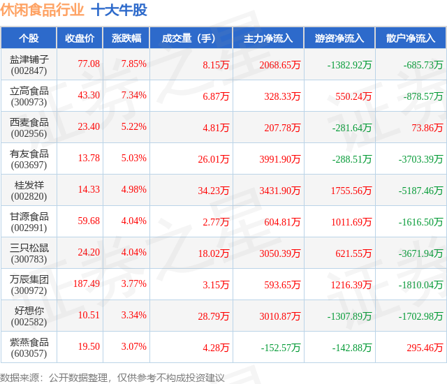 个股表现方面,休闲食品行业当日领涨股为盐津铺子(002847),该股当日报收77.08,上涨7.85%,成交量8.15万,主力资金净流入2068.65万元。立高食品(300973)以上涨7.34%紧随其后,该股当日成交量6.87万,主力资金净流入328.33万元。除此之外,西麦食品(002956)、有友食品(603697)、桂发祥(002820)均进入当日牛股之列。具体个股列表见下表: