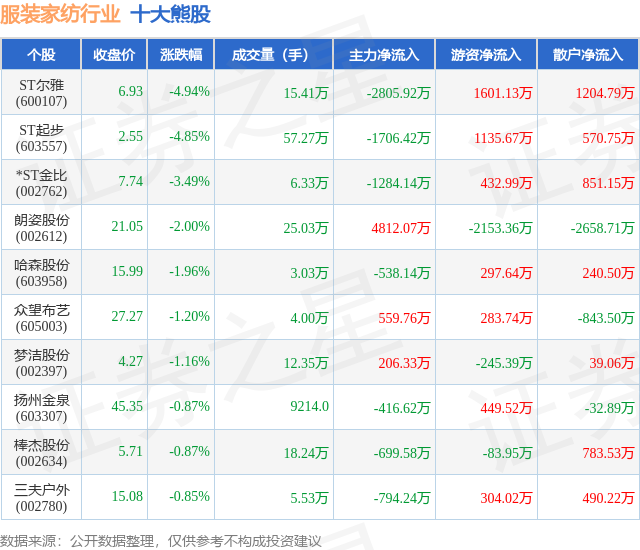 个股表现方面,服装家纺行业当日领跌股为ST尔雅(600107),该股当日报收6.93,下跌4.94%,成交量15.41万,主力资金净流出2805.92万元。ST起步(603557)以下跌4.85%紧随其后,该股当日成交量57.27万,主力资金净流出1706.42万元。除此之外,*ST金比(002762)、朗姿股份(002612)、哈森股份(603958)均进入当日熊股之列。具体个股列表见下表: