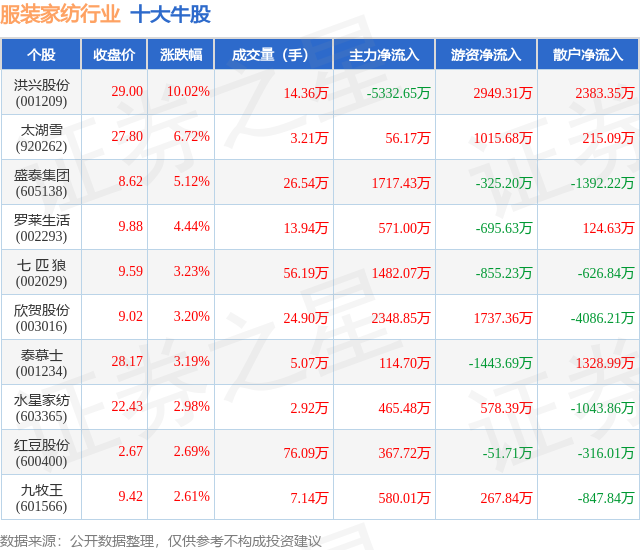 个股表现方面,服装家纺行业当日领涨股为洪兴股份(001209),该股当日报收29.0,上涨10.02%,成交量14.36万,主力资金净流出5332.65万元。太湖雪(920262)以上涨6.72%紧随其后,该股当日成交量3.21万,主力资金净流入56.17万元。除此之外,盛泰集团(605138)、罗莱生活(002293)、七 匹 狼(002029)均进入当日牛股之列。具体个股列表见下表: