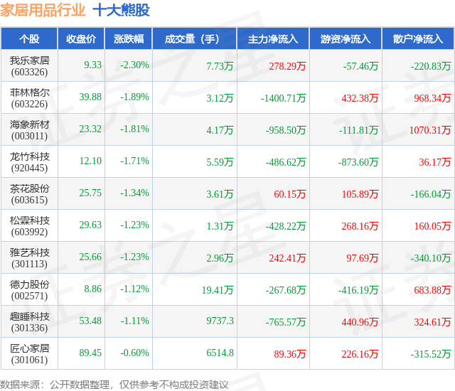个股表现方面,家居用品行业当日领跌股为我乐家居(603326),该股当日报收9.33,下跌2.3%,成交量7.73万,主力资金净流入278.29万元。菲林格尔(603226)以下跌1.89%紧随其后,该股当日成交量3.12万,主力资金净流出1400.71万元。除此之外,海象新材(003011)、龙竹科技(920445)、茶花股份(603615)均进入当日熊股之列。具体个股列表见下表: