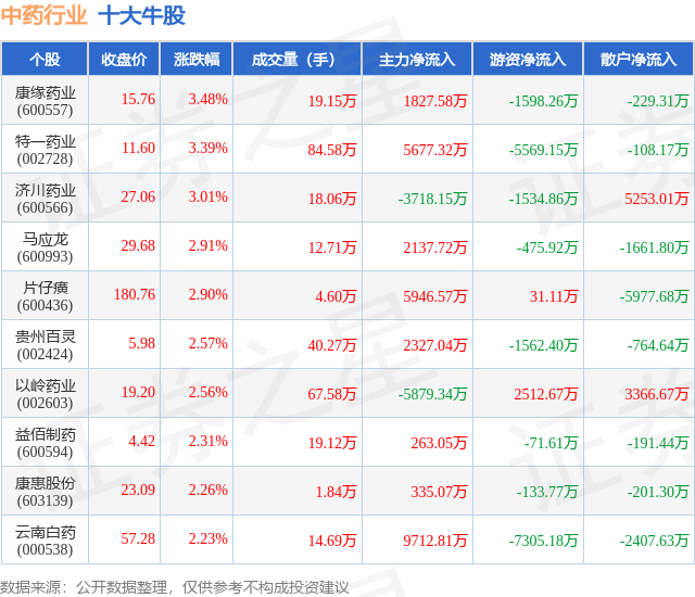 个股表现方面,中药行业当日领涨股为康缘药业(600557),该股当日报收15.76,上涨3.48%,成交量19.15万,主力资金净流入1827.58万元。特一药业(002728)以上涨3.39%紧随其后,该股当日成交量84.58万,主力资金净流入5677.32万元。除此之外,济川药业(600566)、马应龙(600993)、片仔癀(600436)均进入当日牛股之列。具体个股列表见下表: