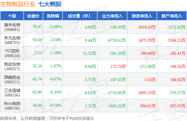 个股表现方面,生物制品行业当日领跌股为康华生物(300841),该股当日报收78.47,下跌2.68%,成交量4.6万,主力资金净流出745.39万元。禾元生物(688765)以下跌1.54%紧随其后,该股当日成交量9.44万,主力资金净流出6739.62万元。除此之外,*ST四环(000518)、我武生物(300357)、西藏药业(600211)均进入当日熊股之列。具体个股列表见下表:
