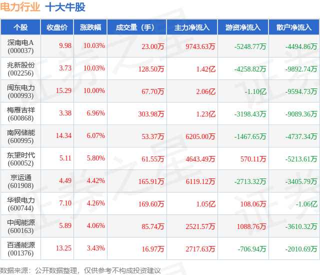 个股表现方面,电力行业当日领涨股为深南电A(000037),该股当日报收9.98,上涨10.03%,成交量23.0万,主力资金净流入9743.63万元。兆新股份(002256)以上涨10.03%紧随其后,该股当日成交量128.5万,主力资金净流入1.42亿元。除此之外,闽东电力(000993)、梅雁吉祥(600868)、南网储能(600995)均进入当日牛股之列。具体个股列表见下表: