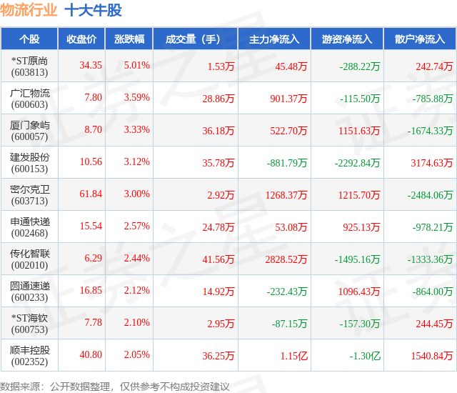 个股表现方面,物流行业当日领涨股为*ST原尚(603813),该股当日报收34.35,上涨5.01%,成交量1.53万,主力资金净流入45.48万元。广汇物流(600603)以上涨3.59%紧随其后,该股当日成交量28.86万,主力资金净流入901.37万元。除此之外,厦门象屿(600057)、建发股份(600153)、密尔克卫(603713)均进入当日牛股之列。具体个股列表见下表: