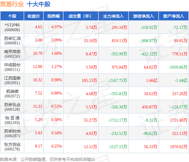 个股表现方面,贸易行业当日领涨股为*ST沪科(600608),该股当日报收4.65,上涨4.97%,成交量5.74万,主力资金净流入291.1万元。苏豪汇鸿(600981)以上涨3.09%紧随其后,该股当日成交量33.1万,主力资金净流入819.13万元。除此之外,南京商旅(600250)、中成股份(000151)、江苏国泰(002091)均进入当日牛股之列。具体个股列表见下表: