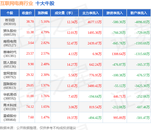 个股表现方面,互联网电商行业当日领涨股为若羽臣(003010),该股当日报收38.7,上涨5.16%,成交量12.34万,主力资金净流入4677.13万元。狮头股份(600539)以上涨4.79%紧随其后,该股当日成交量12.01万,主力资金净流入1495.3万元。除此之外,南极电商(002127)、赛维时代(301381)、丽人丽妆(605136)均进入当日牛股之列。具体个股列表见下表: