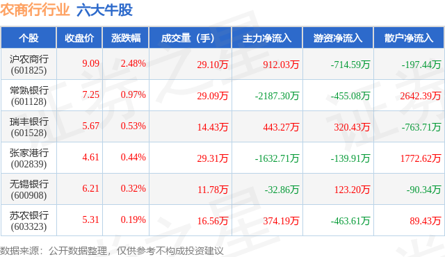 个股表现方面,农商行行业当日领涨股为沪农商行(601825),该股当日报收9.09,上涨2.48%,成交量29.1万,主力资金净流入912.03万元。常熟银行(601128)以上涨0.97%紧随其后,该股当日成交量29.09万,主力资金净流出2187.3万元。除此之外,瑞丰银行(601528)、张家港行(002839)、无锡银行(600908)均进入当日牛股之列。具体个股列表见下表: