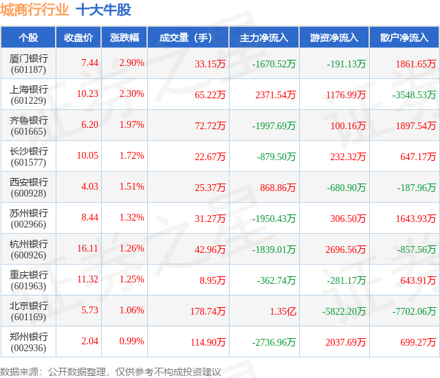 个股表现方面,城商行行业当日领涨股为厦门银行(601187),该股当日报收7.44,上涨2.9%,成交量33.15万,主力资金净流出1670.52万元。上海银行(601229)以上涨2.3%紧随其后,该股当日成交量65.22万,主力资金净流入2371.54万元。除此之外,齐鲁银行(601665)、长沙银行(601577)、西安银行(600928)均进入当日牛股之列。具体个股列表见下表: