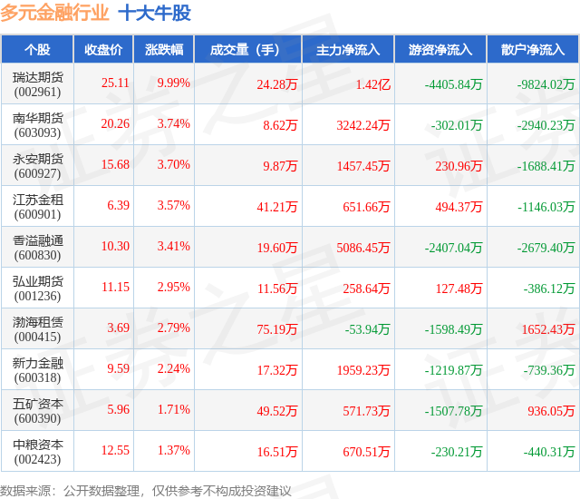 个股表现方面,多元金融行业当日领涨股为瑞达期货(002961),该股当日报收25.11,上涨9.99%,成交量24.28万,主力资金净流入1.42亿元。南华期货(603093)以上涨3.74%紧随其后,该股当日成交量8.62万,主力资金净流入3242.24万元。除此之外,永安期货(600927)、江苏金租(600901)、香溢融通(600830)均进入当日牛股之列。具体个股列表见下表: