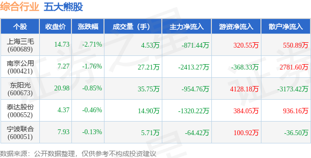 个股表现方面,综合行业当日领跌股为上海三毛(600689),该股当日报收14.73,下跌2.71%,成交量4.53万,主力资金净流出871.44万元。南京公用(000421)以下跌1.76%紧随其后,该股当日成交量27.21万,主力资金净流出2413.27万元。除此之外,东阳光(600673)、泰达股份(000652)、宁波联合(600051)均进入当日熊股之列。具体个股列表见下表: