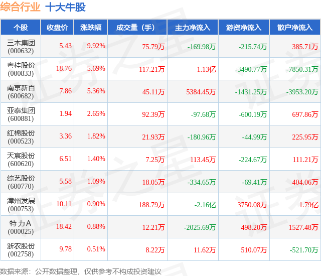 个股表现方面,综合行业当日领涨股为三木集团(000632),该股当日报收5.43,上涨9.92%,成交量75.79万,主力资金净流出169.98万元。粤桂股份(000833)以上涨5.69%紧随其后,该股当日成交量117.21万,主力资金净流入1.13亿元。除此之外,南京新百(600682)、亚泰集团(600881)、红棉股份(000523)均进入当日牛股之列。具体个股列表见下表: