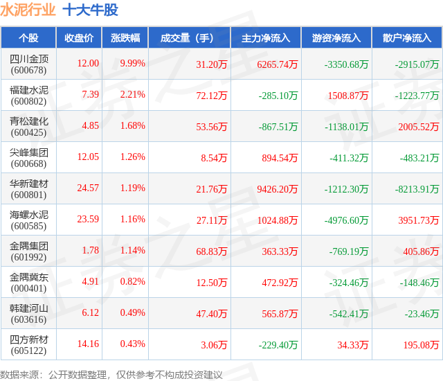 个股表现方面,水泥行业当日领涨股为四川金顶(600678),该股当日报收12.0,上涨9.99%,成交量31.2万,主力资金净流入6265.74万元。福建水泥(600802)以上涨2.21%紧随其后,该股当日成交量72.12万,主力资金净流出285.1万元。除此之外,青松建化(600425)、尖峰集团(600668)、华新建材(600801)均进入当日牛股之列。具体个股列表见下表: