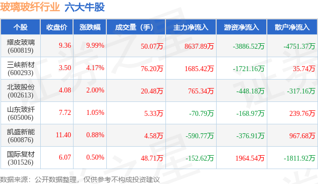 个股表现方面,玻璃玻纤行业当日领涨股为耀皮玻璃(600819),该股当日报收9.36,上涨9.99%,成交量50.07万,主力资金净流入8637.89万元。三峡新材(600293)以上涨4.17%紧随其后,该股当日成交量76.2万,主力资金净流入1685.42万元。除此之外,北玻股份(002613)、山东玻纤(605006)、凯盛新能(600876)均进入当日牛股之列。具体个股列表见下表: